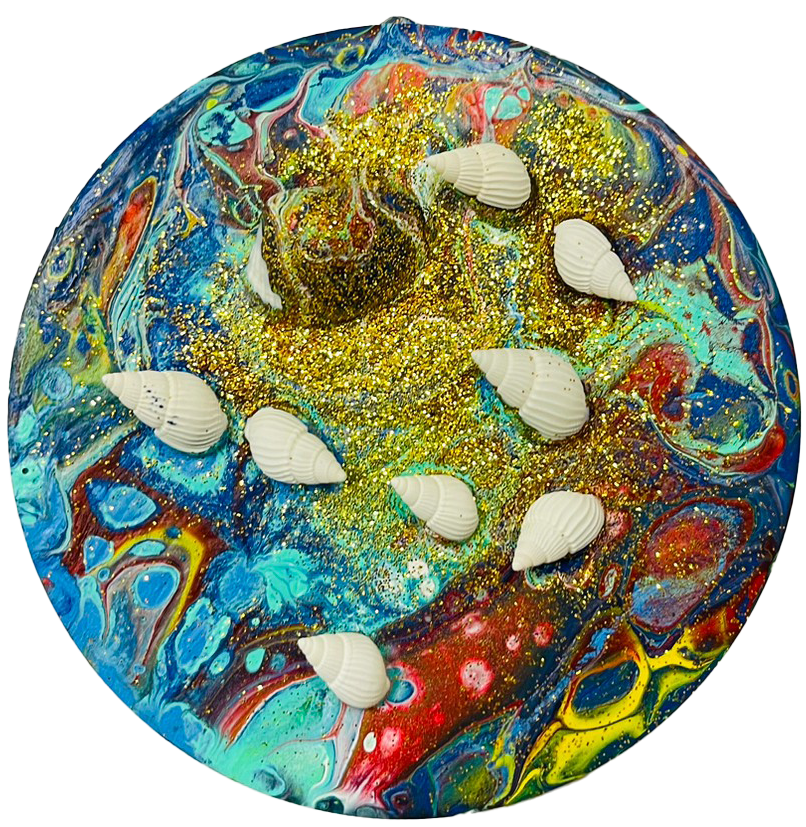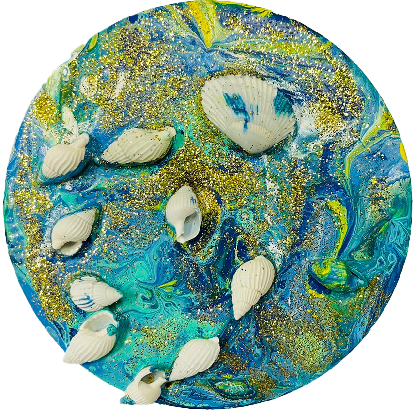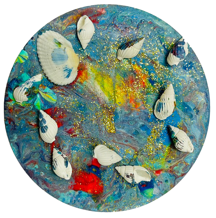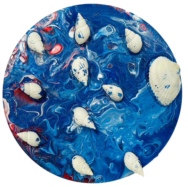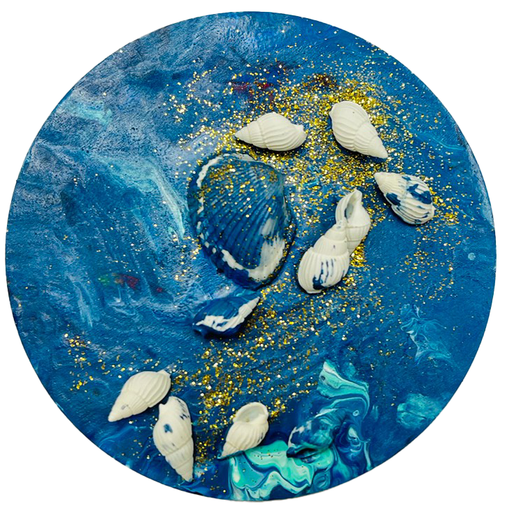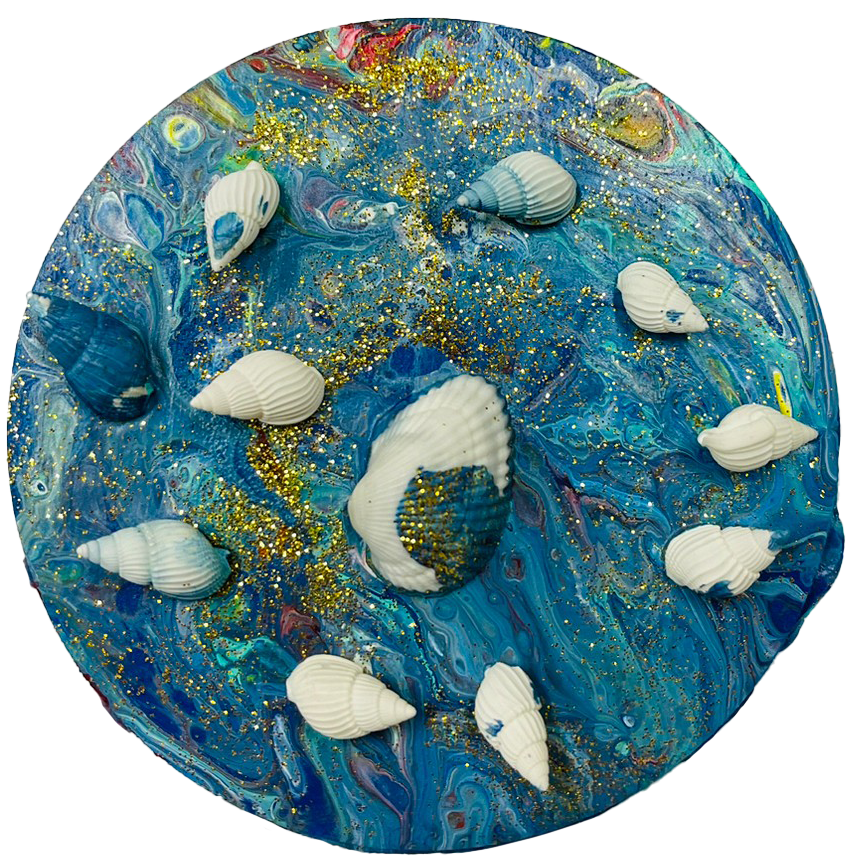 流動畫杯墊活動《海洋之心》,此次邀請Ruby老師指導,透過細胞流動畫顏料的流動及碰撞,產生與眾不同的流動線條與美感,加上貝殼及金粉的裝飾,完美呈現屬於孩子們奔放繽紛的海洋之心。