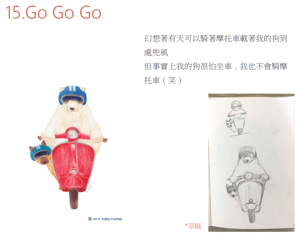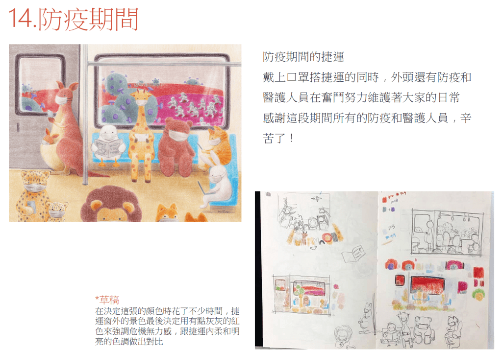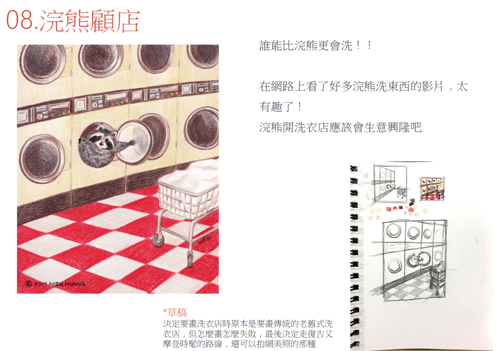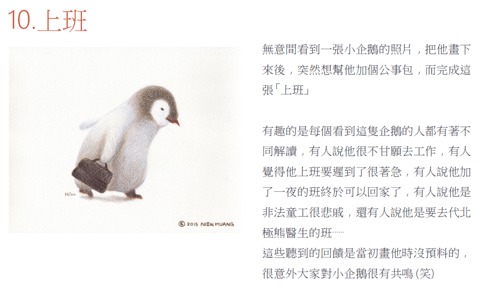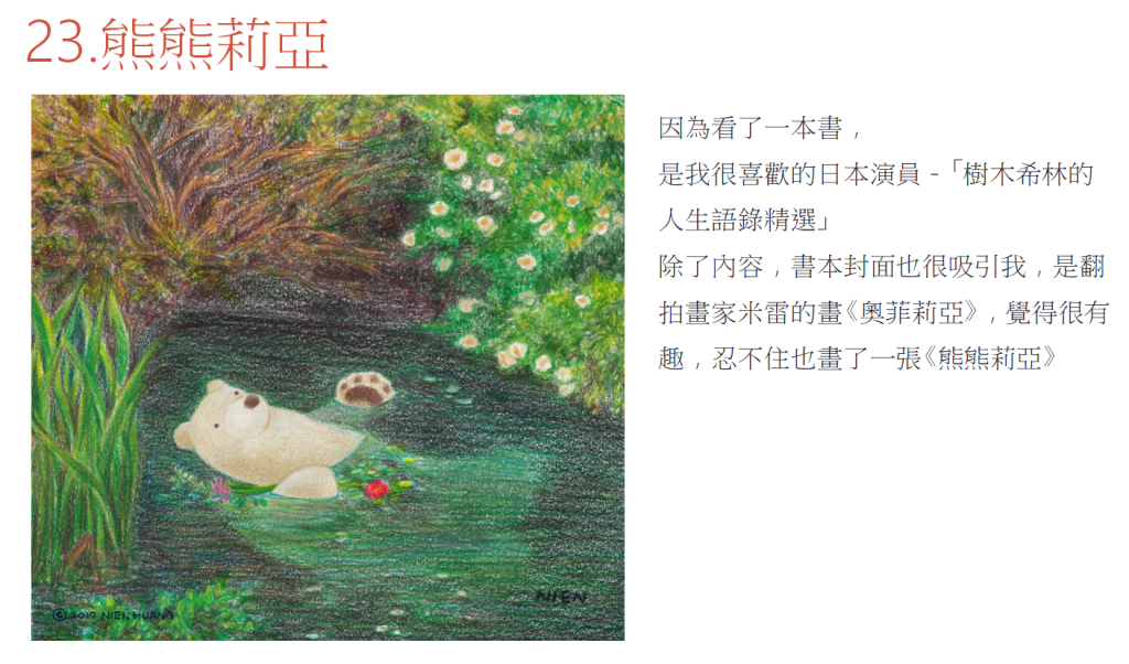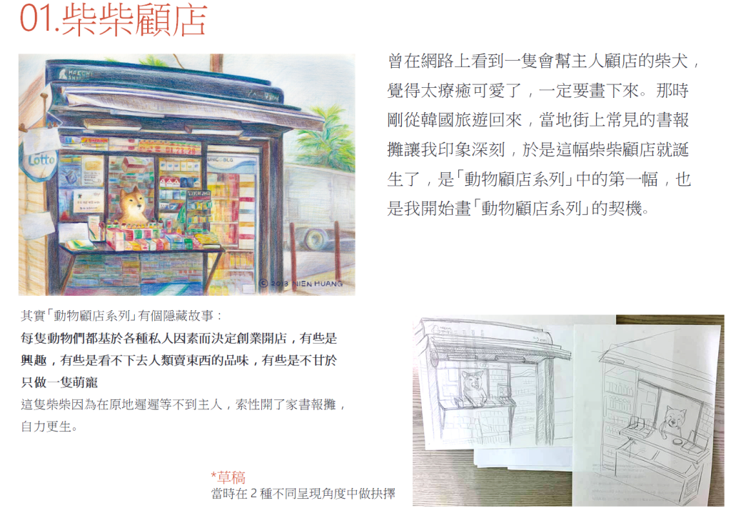 擅長用色鉛筆以擬人的手法來描繪動物與生活點滴